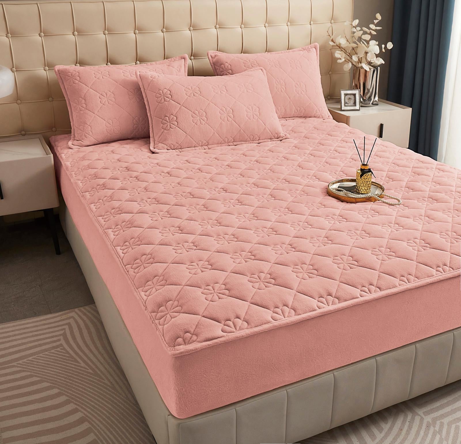 Husa Pufoasa de Pat din Catifea Matlasata+ 2 Fete de Perna-Roz