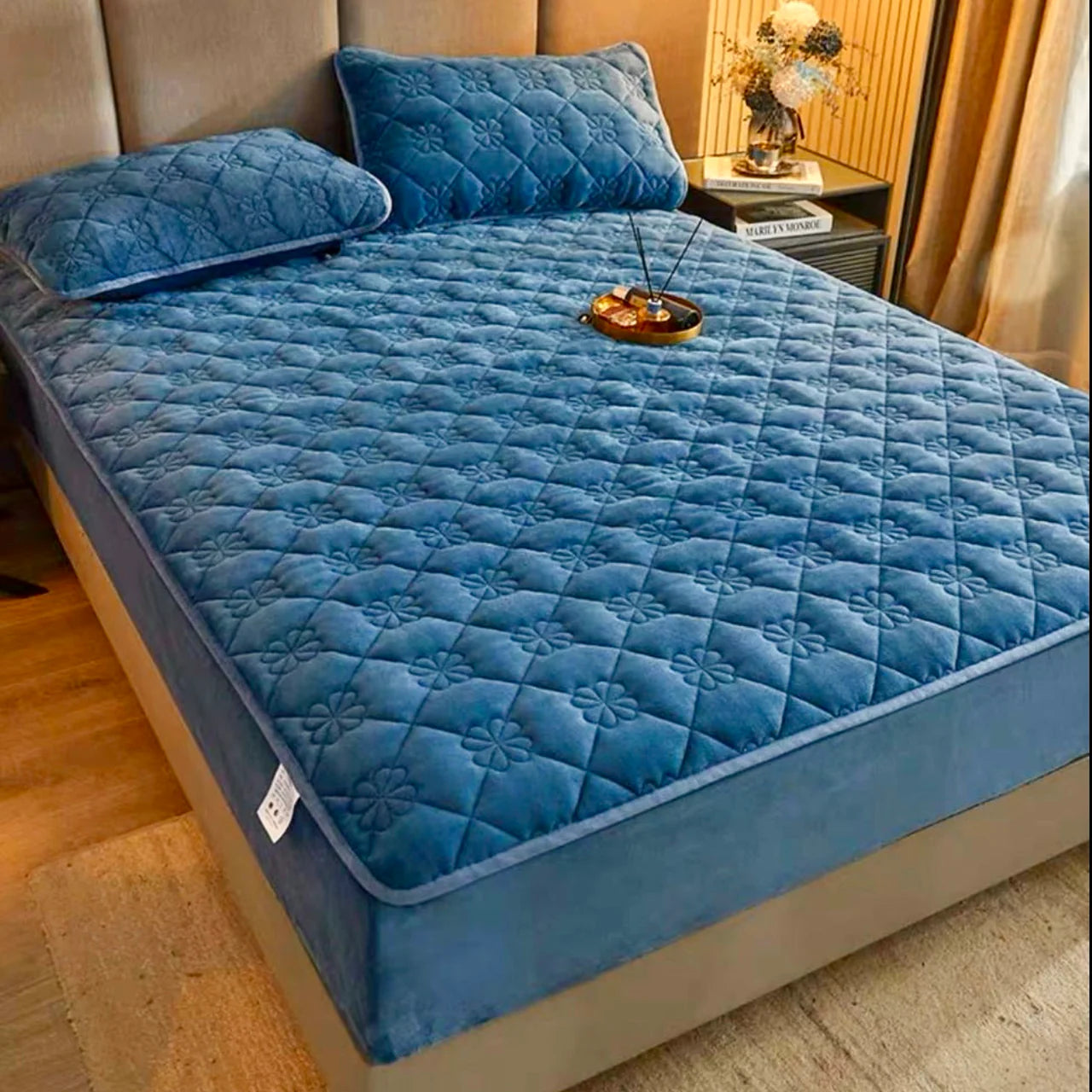 Husa Pufoasa de Pat din Catifea Matlasata+ 2 Fete de Perna- Albastru