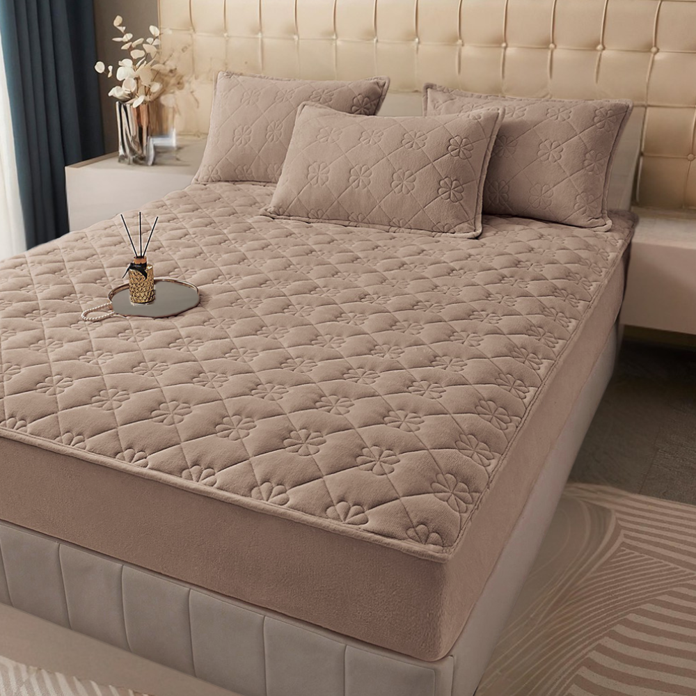 Husa Pufoasa de Pat din Catifea Matlasata + 2 Fete de Perna - Maro Deschis